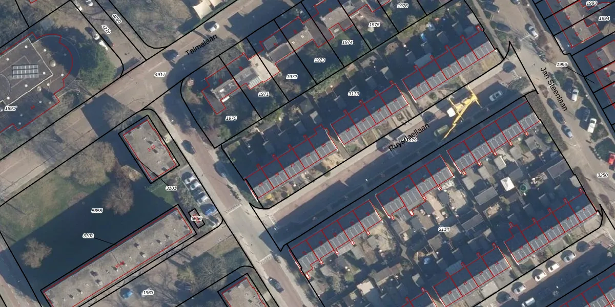 Het perceel waarop Ruysdaellaan 22 staat heeft een oppervlakte van 2395 m². Dit is een zeer groot perceel. De perceeloppervlakte wordt geregistreerd door het Kadaster. Gedetailleerde informatie over de maten van dit perceel kunt u vinden in het rapport Kadastrale kaart met maatvoering van Ruysdaellaan 22.