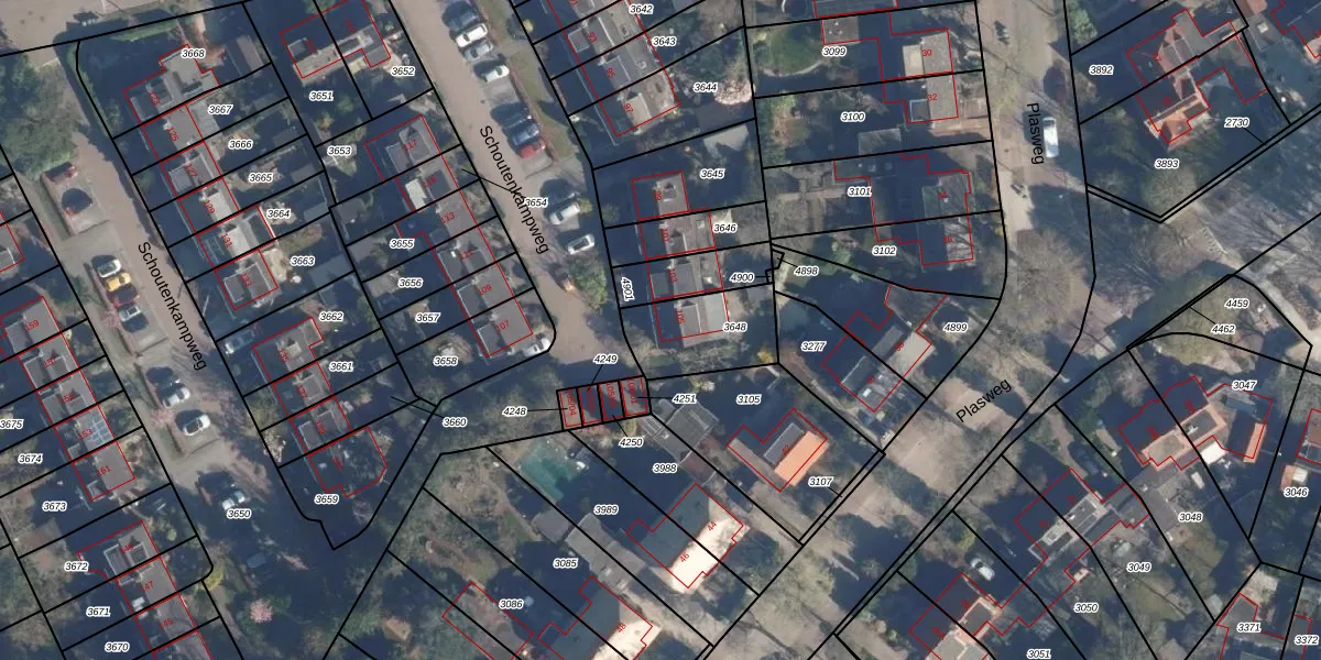Schoutenkampweg 105 is gelegen op kadastraal perceel SOE00D3648. Deze kadastrale aanduiding is uniek en wordt gebruikt door het Kadaster om eigendomsrechten en andere zakelijke rechten vast te leggen. Het perceel maakt onderdeel uit van de kadastrale gemeente Soest.