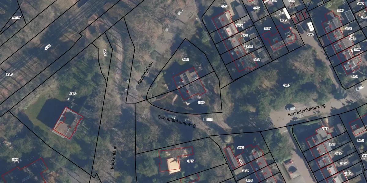 Schoutenkampweg 90 is gelegen op kadastraal perceel SOE00D3683. Deze kadastrale aanduiding is uniek en wordt gebruikt door het Kadaster om eigendomsrechten en andere zakelijke rechten vast te leggen. Het perceel maakt onderdeel uit van de kadastrale gemeente Soest.