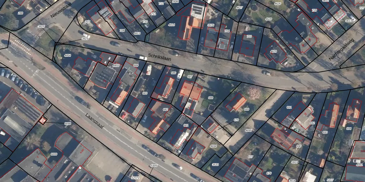 Schrikslaan 59 is gelegen op kadastraal perceel SOE00K687. Deze kadastrale aanduiding is uniek en wordt gebruikt door het Kadaster om eigendomsrechten en andere zakelijke rechten vast te leggen. Het perceel maakt onderdeel uit van de kadastrale gemeente Soest.