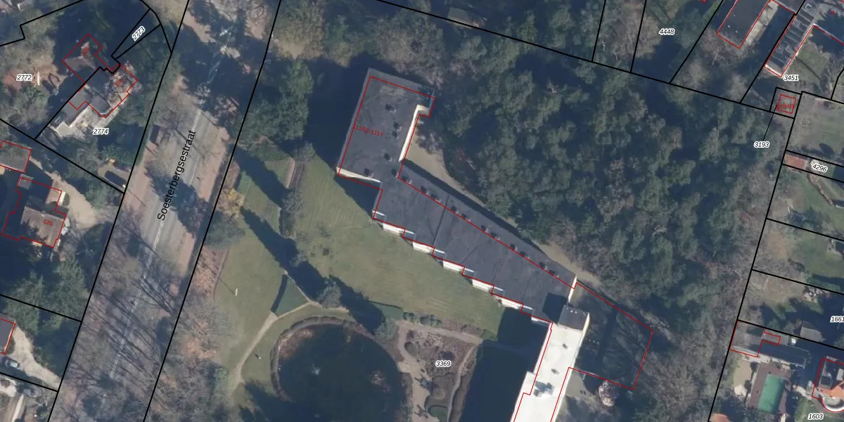 Het perceel waarop Soesterbergsestraat 111-202 staat heeft een oppervlakte van 1,9 ha. Dit is een zeer groot perceel. De perceeloppervlakte wordt geregistreerd door het Kadaster. Gedetailleerde informatie over de maten van dit perceel kunt u vinden in het rapport Kadastrale kaart met maatvoering van Soesterbergsestraat 111-202.