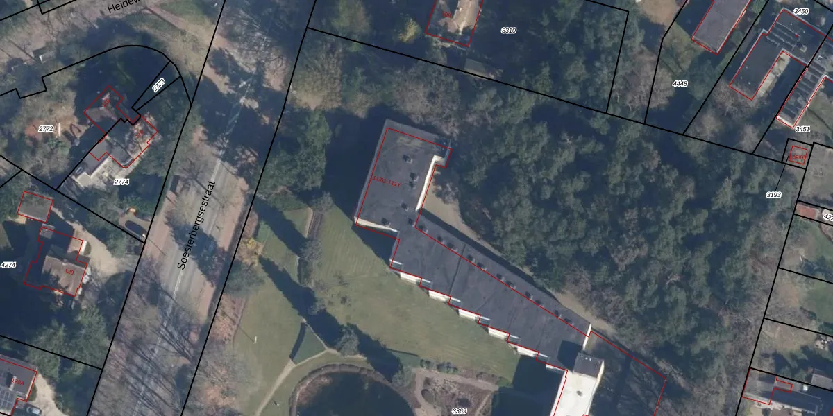 Het perceel waarop Soesterbergsestraat 111-D staat heeft een oppervlakte van 1,9 ha. Dit is een zeer groot perceel. De perceeloppervlakte wordt geregistreerd door het Kadaster. Gedetailleerde informatie over de maten van dit perceel kunt u vinden in het rapport Kadastrale kaart met maatvoering van Soesterbergsestraat 111-D.