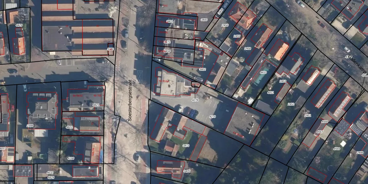Het adres is gelegen op perceel 4279 in de sectie C en de kadastrale gemeente Soest. De kadastrale aanduiding is aldus SOE00-C-4279. Het perceel is kleiner dan gemiddeld in Soest. Het perceel is 1284 m² groot, terwijl het gemiddelde ligt op 2254,97 m². De grootste perceeloppervlakte in de kadastrale gemeente is 1,42 km². De kleinste oppervlakte bedraagt 0 m². Op het perceel zijn 12 adressen aanwezig. De huidige grenzen van het perceel zijn digitaal in de Basisregistratie Kadaster (BRK) geregistreerd op 09-06-2008.