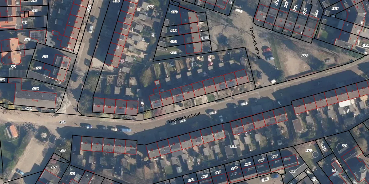 Het perceel waarop Thorbeckestraat 46 staat heeft een oppervlakte van 5305 m². Dit is een zeer groot perceel. De perceeloppervlakte wordt geregistreerd door het Kadaster. Gedetailleerde informatie over de maten van dit perceel kunt u vinden in het rapport Kadastrale kaart met maatvoering van Thorbeckestraat 46.