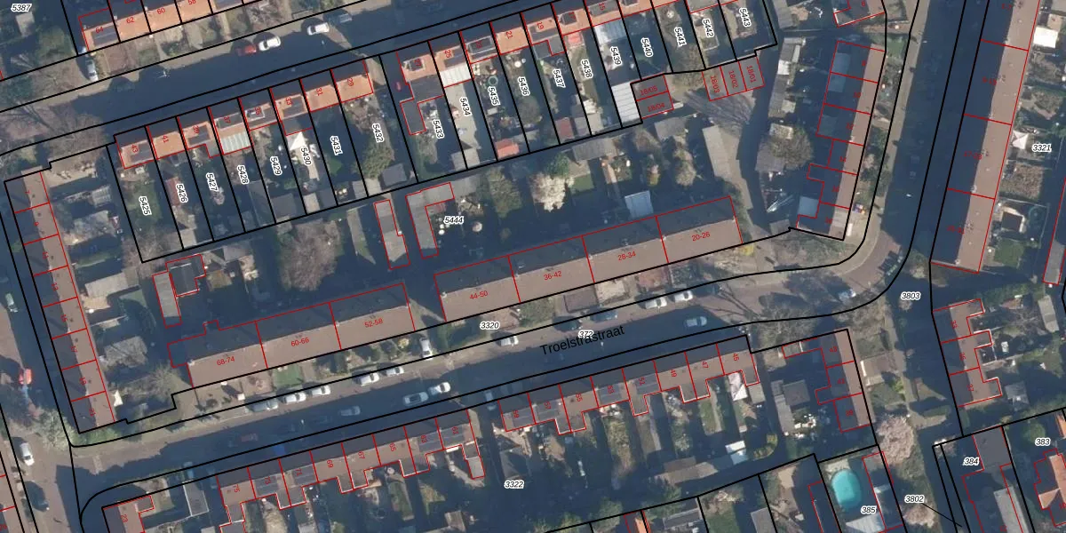 Troelstrastraat 42 is gelegen op kadastraal perceel SOE00K5444. Deze kadastrale aanduiding is uniek en wordt gebruikt door het Kadaster om eigendomsrechten en andere zakelijke rechten vast te leggen. Het perceel maakt onderdeel uit van de kadastrale gemeente Soest.