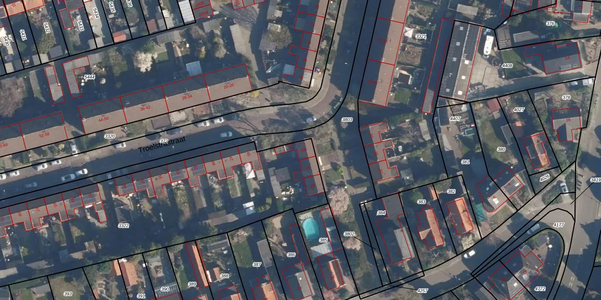 Troelstrastraat 43 is gelegen op kadastraal perceel SOE00K3322. Deze kadastrale aanduiding is uniek en wordt gebruikt door het Kadaster om eigendomsrechten en andere zakelijke rechten vast te leggen. Het perceel maakt onderdeel uit van de kadastrale gemeente Soest.