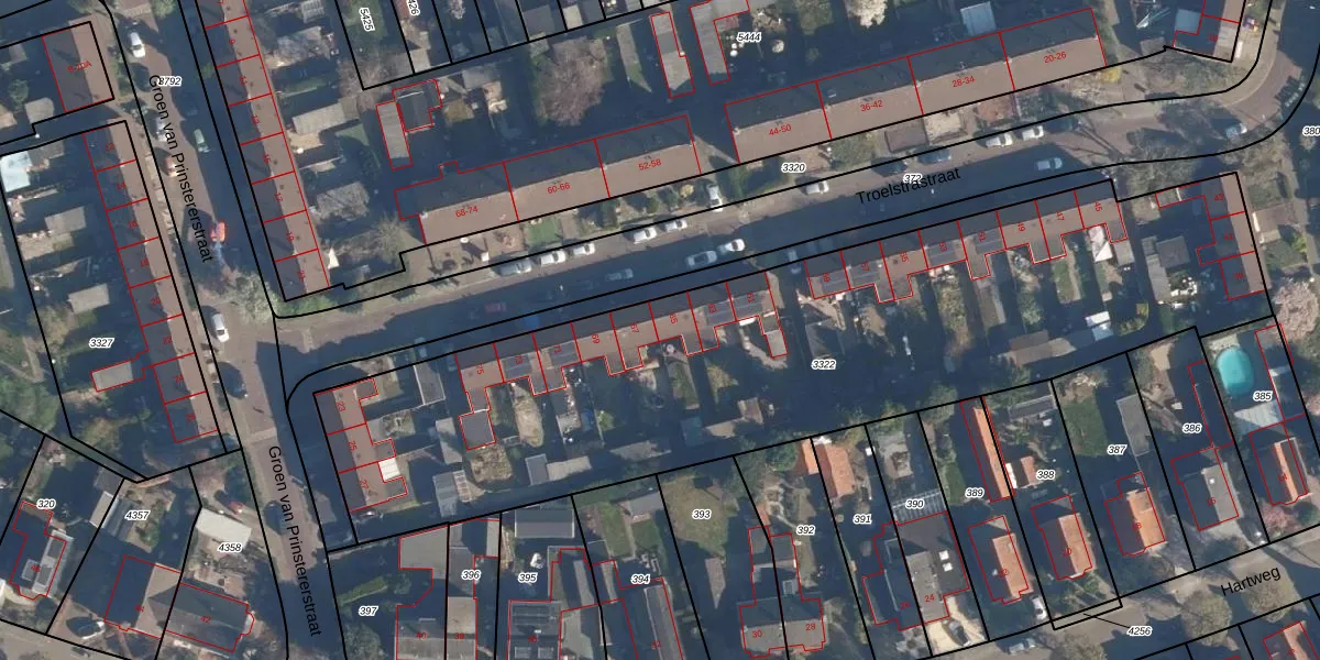 Troelstrastraat 65 is gelegen op kadastraal perceel SOE00K3322. Deze kadastrale aanduiding is uniek en wordt gebruikt door het Kadaster om eigendomsrechten en andere zakelijke rechten vast te leggen. Het perceel maakt onderdeel uit van de kadastrale gemeente Soest.