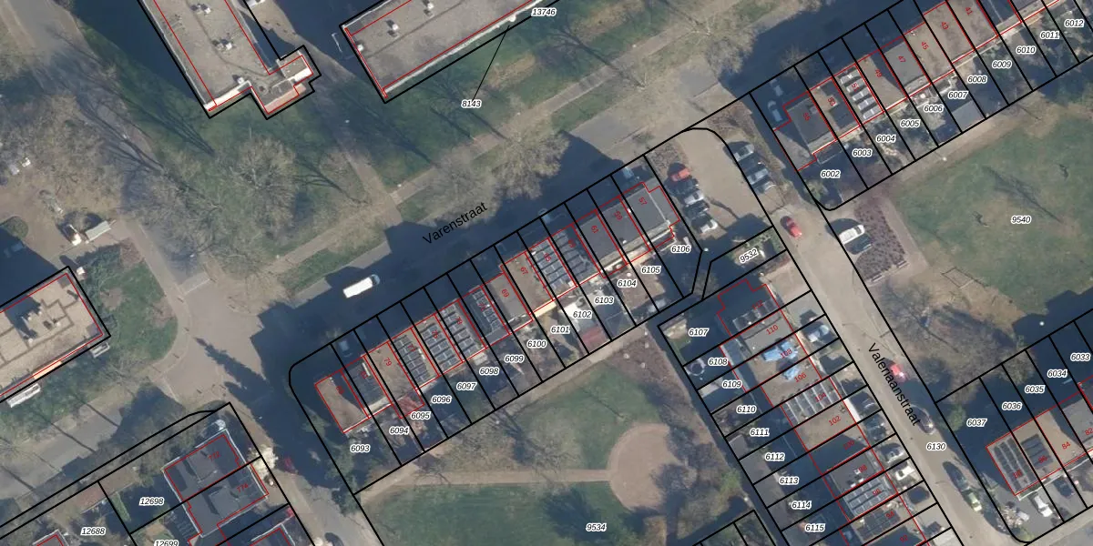 Varenstraat 65 is gelegen op kadastraal perceel SOE00G6102. Deze kadastrale aanduiding is uniek en wordt gebruikt door het Kadaster om eigendomsrechten en andere zakelijke rechten vast te leggen. Het perceel maakt onderdeel uit van de kadastrale gemeente Soest.