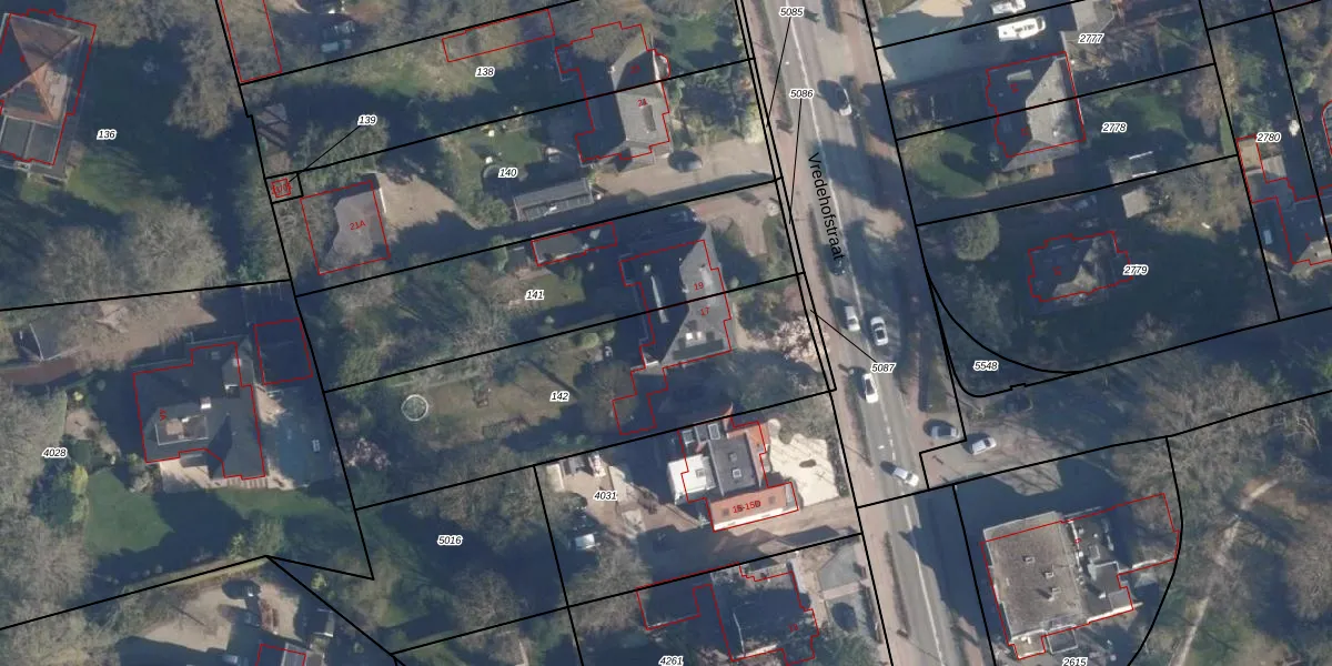 Het perceel waarop Vredehofstraat 17 staat heeft een oppervlakte van 1330 m². Dit is een zeer groot perceel. De perceeloppervlakte wordt geregistreerd door het Kadaster. Gedetailleerde informatie over de maten van dit perceel kunt u vinden in het rapport Kadastrale kaart met maatvoering van Vredehofstraat 17.
