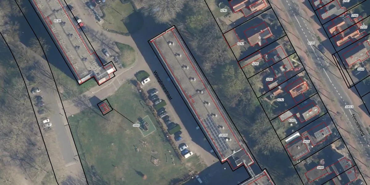 Het perceel waarop Weegbreestraat 361-387 staat heeft een oppervlakte van 2740 m². Dit is een zeer groot perceel. De perceeloppervlakte wordt geregistreerd door het Kadaster. Gedetailleerde informatie over de maten van dit perceel kunt u vinden in het rapport Kadastrale kaart met maatvoering van Weegbreestraat 361-387.