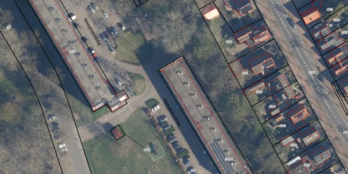 Het perceel waarop Weegbreestraat 361-381 staat heeft een oppervlakte van 2740 m². Dit is een zeer groot perceel. De perceeloppervlakte wordt geregistreerd door het Kadaster. Gedetailleerde informatie over de maten van dit perceel kunt u vinden in het rapport Kadastrale kaart met maatvoering van Weegbreestraat 361-381.