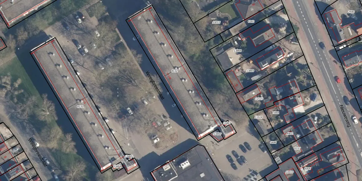 Het perceel waarop Weegbreestraat 89 staat heeft een oppervlakte van 1353 m². Dit is een zeer groot perceel. De perceeloppervlakte wordt geregistreerd door het Kadaster. Gedetailleerde informatie over de maten van dit perceel kunt u vinden in het rapport Kadastrale kaart met maatvoering van Weegbreestraat 89.