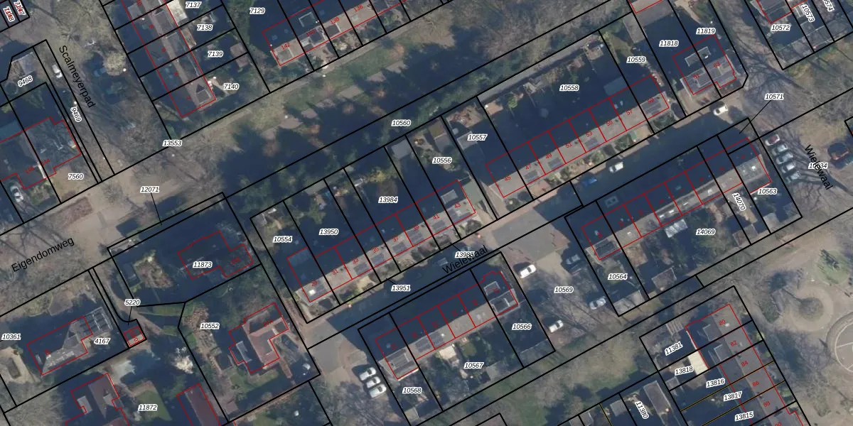 Het perceel waarop Wielewaal 41 staat heeft een oppervlakte van 157 m². Dit is een middelgroot perceel. De perceeloppervlakte wordt geregistreerd door het Kadaster. Gedetailleerde informatie over de maten van dit perceel kunt u vinden in het rapport Kadastrale kaart met maatvoering van Wielewaal 41.