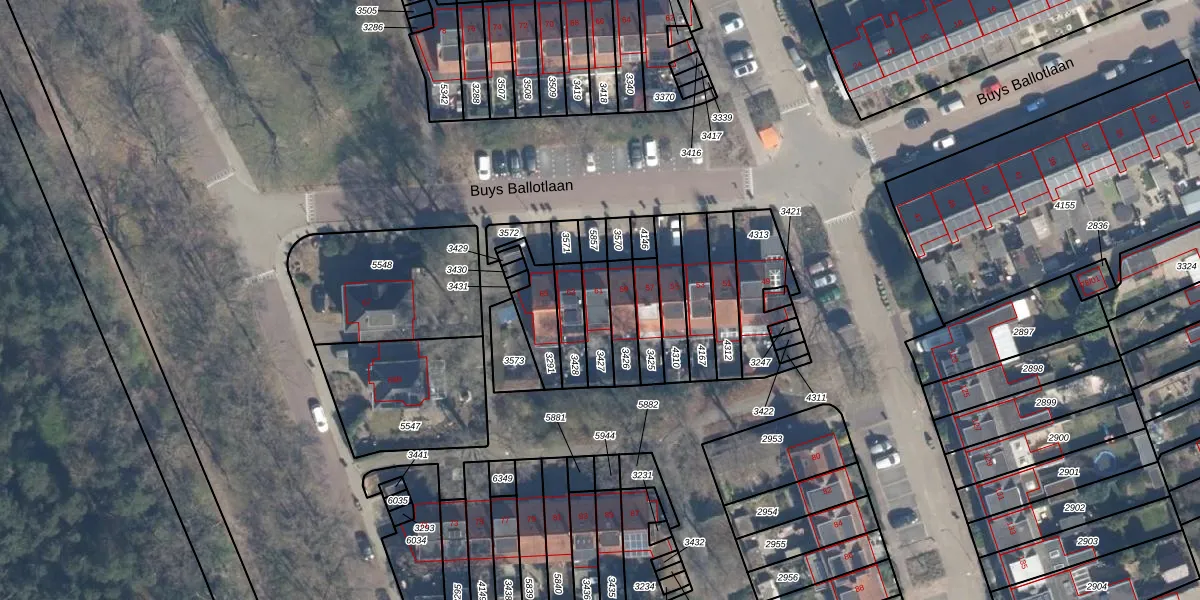 Het perceel waarop Buys Ballotlaan 61 staat heeft een oppervlakte van 88 m². Dit is een klein perceel. De perceeloppervlakte wordt geregistreerd door het Kadaster. Gedetailleerde informatie over de maten van dit perceel kunt u vinden in het rapport Kadastrale kaart met maatvoering van Buys Ballotlaan 61.