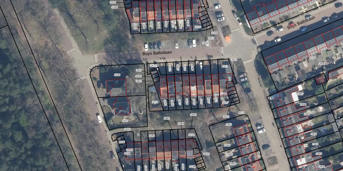 Het perceel waarop Buys Ballotlaan 63 staat heeft een oppervlakte van 88 m². Dit is een klein perceel. De perceeloppervlakte wordt geregistreerd door het Kadaster. Gedetailleerde informatie over de maten van dit perceel kunt u vinden in het rapport Kadastrale kaart met maatvoering van Buys Ballotlaan 63.