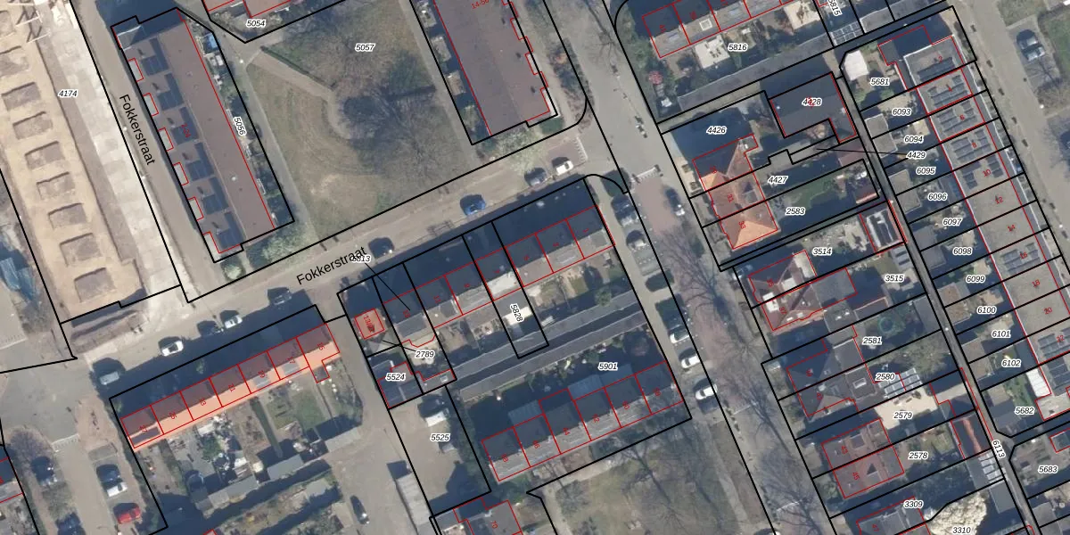 Het perceel waarop Fokkerstraat 5 staat heeft een oppervlakte van 2006 m². Dit is een zeer groot perceel. De perceeloppervlakte wordt geregistreerd door het Kadaster. Gedetailleerde informatie over de maten van dit perceel kunt u vinden in het rapport Kadastrale kaart met maatvoering van Fokkerstraat 5.