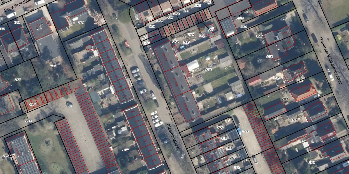 Het perceel waarop Plesmanstraat 179 staat heeft een oppervlakte van 2405 m². Dit is een zeer groot perceel. De perceeloppervlakte wordt geregistreerd door het Kadaster. Gedetailleerde informatie over de maten van dit perceel kunt u vinden in het rapport Kadastrale kaart met maatvoering van Plesmanstraat 179.
