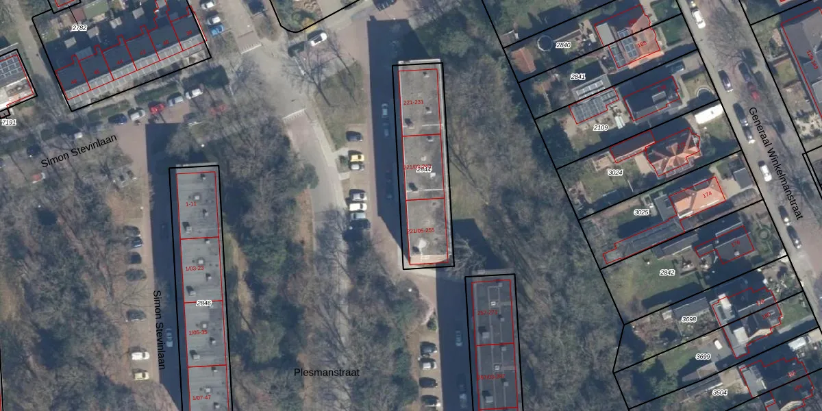 Plesmanstraat 221-05 is gelegen op kadastraal perceel SOE00E2844. Deze kadastrale aanduiding is uniek en wordt gebruikt door het Kadaster om eigendomsrechten en andere zakelijke rechten vast te leggen. Het perceel maakt onderdeel uit van de kadastrale gemeente Soest.