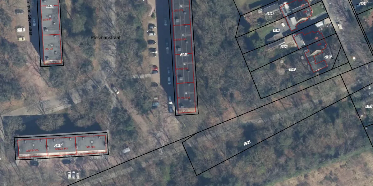 Plesmanstraat 313 is gelegen op kadastraal perceel SOE00E2845. Deze kadastrale aanduiding is uniek en wordt gebruikt door het Kadaster om eigendomsrechten en andere zakelijke rechten vast te leggen. Het perceel maakt onderdeel uit van de kadastrale gemeente Soest.