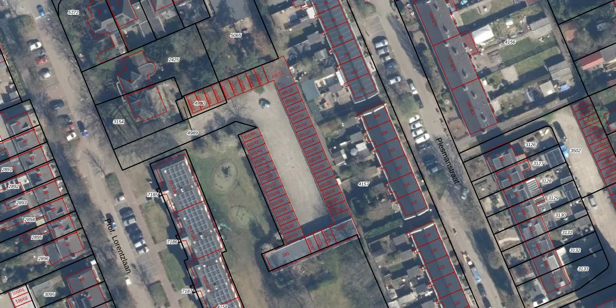 Prof. Lorentzlaan 101-19 is gelegen op kadastraal perceel SOE00E4157. Deze kadastrale aanduiding is uniek en wordt gebruikt door het Kadaster om eigendomsrechten en andere zakelijke rechten vast te leggen. Het perceel maakt onderdeel uit van de kadastrale gemeente Soest.