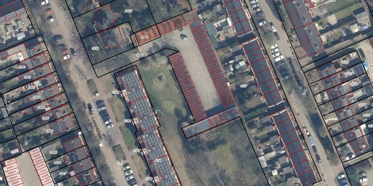Prof. Lorentzlaan 101-36 is gelegen op kadastraal perceel SOE00E4157. Deze kadastrale aanduiding is uniek en wordt gebruikt door het Kadaster om eigendomsrechten en andere zakelijke rechten vast te leggen. Het perceel maakt onderdeel uit van de kadastrale gemeente Soest.