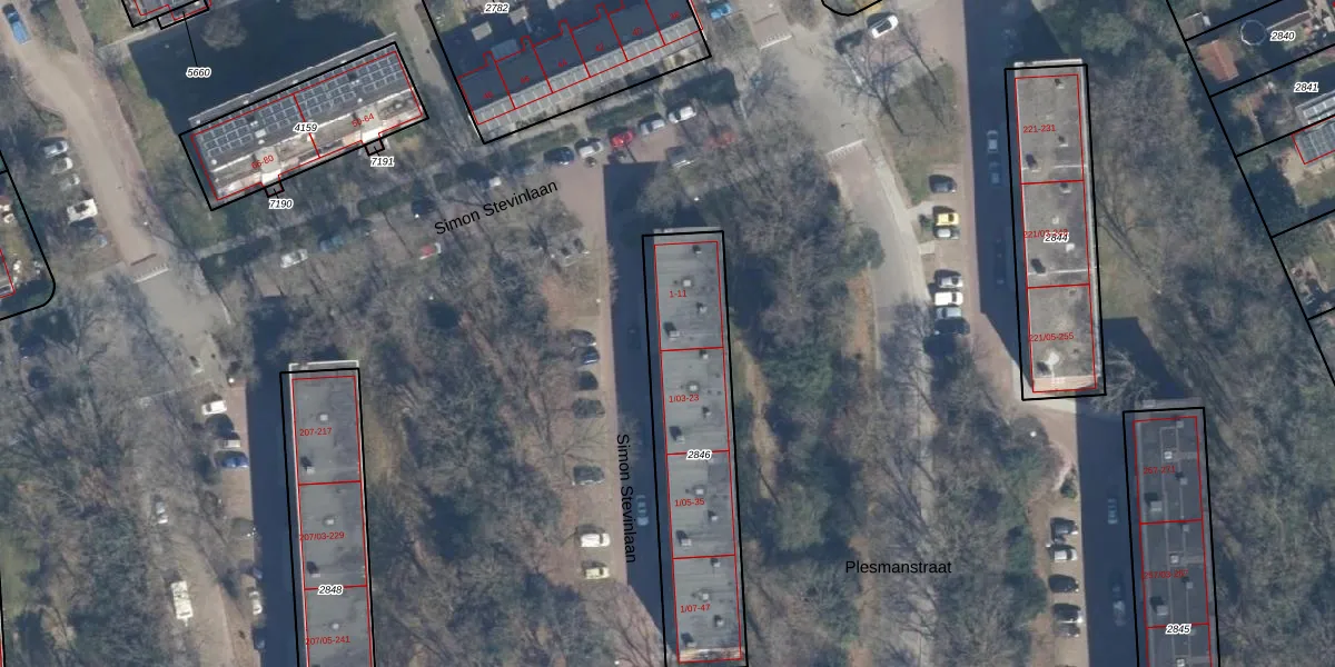 Simon Stevinlaan 1-01 is gelegen op kadastraal perceel SOE00E2846. Deze kadastrale aanduiding is uniek en wordt gebruikt door het Kadaster om eigendomsrechten en andere zakelijke rechten vast te leggen. Het perceel maakt onderdeel uit van de kadastrale gemeente Soest.