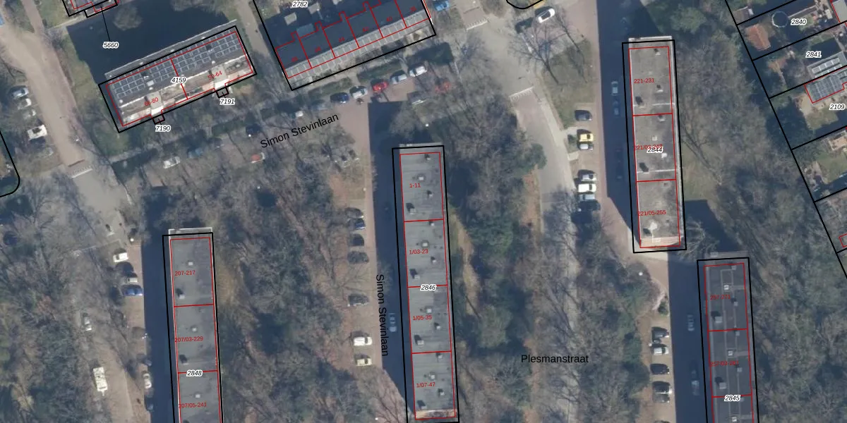 Simon Stevinlaan 1-02 is gelegen op kadastraal perceel SOE00E2846. Deze kadastrale aanduiding is uniek en wordt gebruikt door het Kadaster om eigendomsrechten en andere zakelijke rechten vast te leggen. Het perceel maakt onderdeel uit van de kadastrale gemeente Soest.
