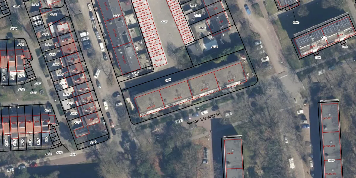 Simon Stevinlaan 114 is gelegen op kadastraal perceel SOE00E4978. Deze kadastrale aanduiding is uniek en wordt gebruikt door het Kadaster om eigendomsrechten en andere zakelijke rechten vast te leggen. Het perceel maakt onderdeel uit van de kadastrale gemeente Soest.