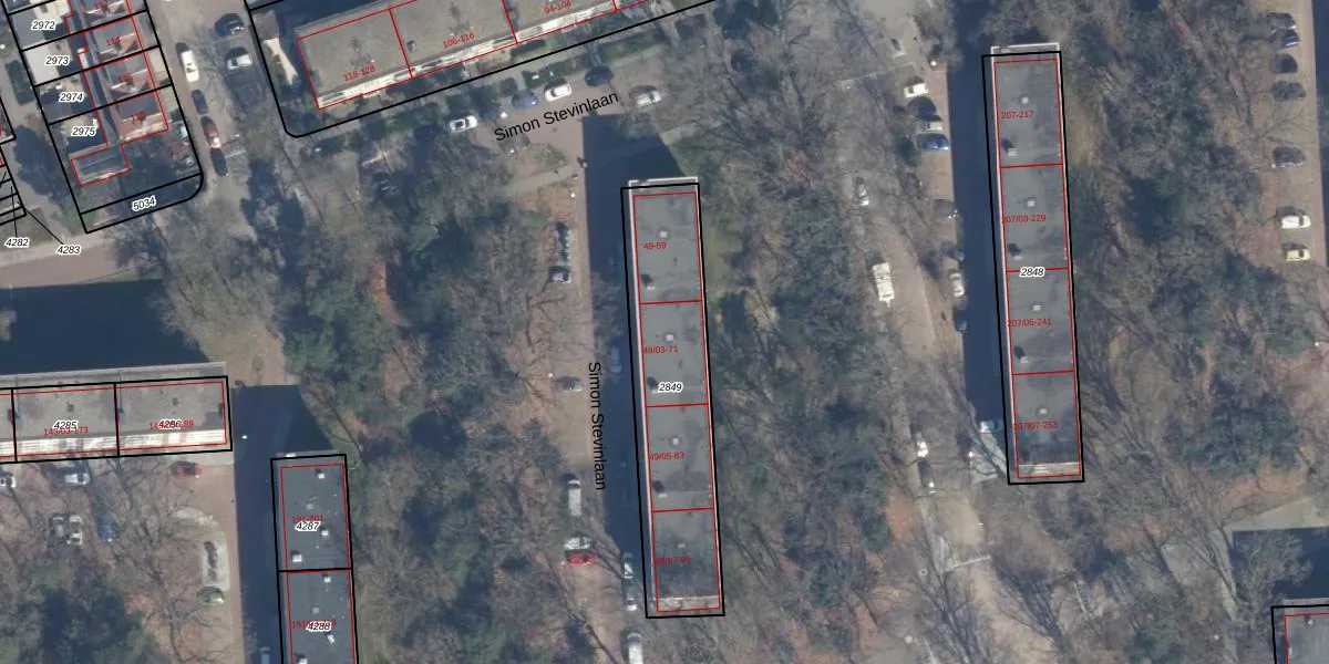 Simon Stevinlaan 65 is gelegen op kadastraal perceel SOE00E2849. Deze kadastrale aanduiding is uniek en wordt gebruikt door het Kadaster om eigendomsrechten en andere zakelijke rechten vast te leggen. Het perceel maakt onderdeel uit van de kadastrale gemeente Soest.