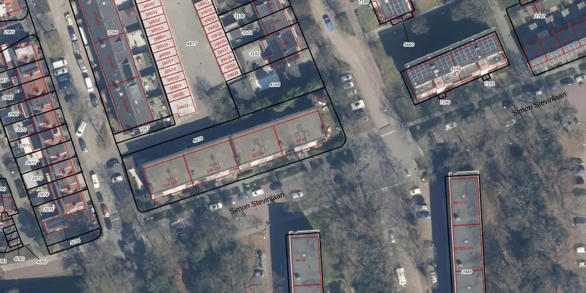 Simon Stevinlaan 84 is gelegen op kadastraal perceel SOE00E4978. Deze kadastrale aanduiding is uniek en wordt gebruikt door het Kadaster om eigendomsrechten en andere zakelijke rechten vast te leggen. Het perceel maakt onderdeel uit van de kadastrale gemeente Soest.