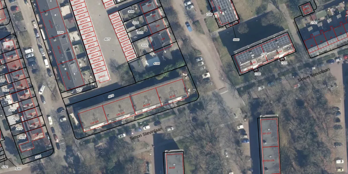 Simon Stevinlaan 90 is gelegen op kadastraal perceel SOE00E4978. Deze kadastrale aanduiding is uniek en wordt gebruikt door het Kadaster om eigendomsrechten en andere zakelijke rechten vast te leggen. Het perceel maakt onderdeel uit van de kadastrale gemeente Soest.