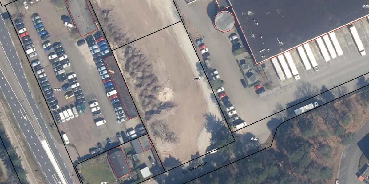 Het perceel waarop W. Stuutlaan 1-08 staat heeft een oppervlakte van 3018 m². Dit is een zeer groot perceel. De perceeloppervlakte wordt geregistreerd door het Kadaster. Gedetailleerde informatie over de maten van dit perceel kunt u vinden in het rapport Kadastrale kaart met maatvoering van W. Stuutlaan 1-08.