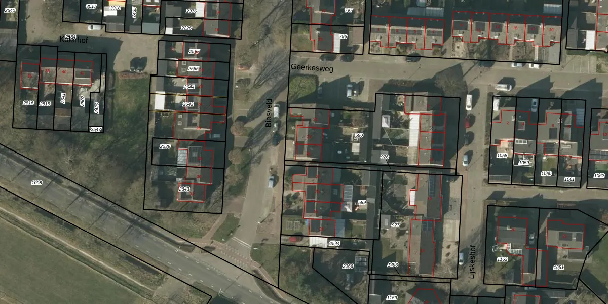 Het perceel waarop Biesveld 25 staat heeft een oppervlakte van 1143 m². Dit is een zeer groot perceel. De perceeloppervlakte wordt geregistreerd door het Kadaster. Gedetailleerde informatie over de maten van dit perceel kunt u vinden in het rapport Kadastrale kaart met maatvoering van Biesveld 25.