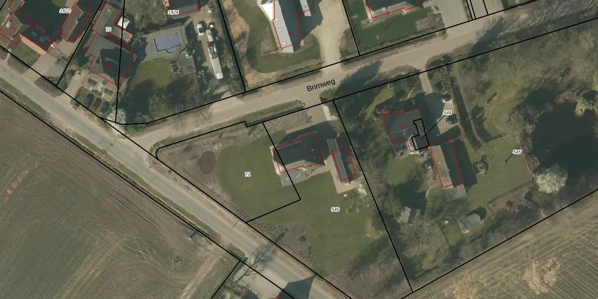 Het perceel waarop Brimweg 29 staat heeft een oppervlakte van 1960 m². Dit is een zeer groot perceel. De perceeloppervlakte wordt geregistreerd door het Kadaster. Gedetailleerde informatie over de maten van dit perceel kunt u vinden in het rapport Kadastrale kaart met maatvoering van Brimweg 29.