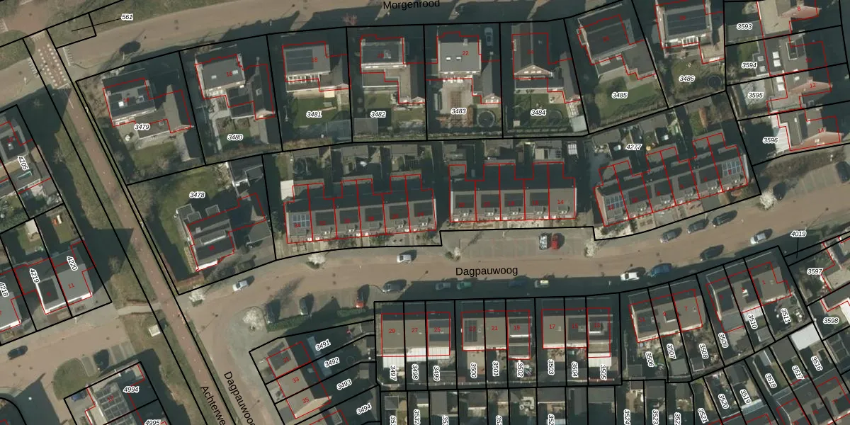 Het perceel waarop Dagpauwoog 24 staat heeft een oppervlakte van 2720 m². Dit is een zeer groot perceel. De perceeloppervlakte wordt geregistreerd door het Kadaster. Gedetailleerde informatie over de maten van dit perceel kunt u vinden in het rapport Kadastrale kaart met maatvoering van Dagpauwoog 24.