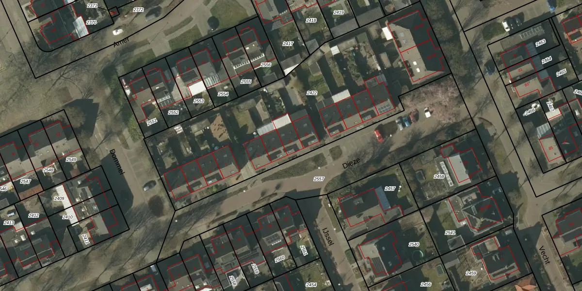 Het perceel waarop Dieze 13 staat heeft een oppervlakte van 2990 m². Dit is een zeer groot perceel. De perceeloppervlakte wordt geregistreerd door het Kadaster. Gedetailleerde informatie over de maten van dit perceel kunt u vinden in het rapport Kadastrale kaart met maatvoering van Dieze 13.