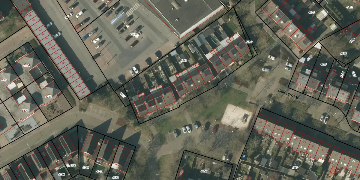Het perceel waarop Dillerstraat 44 staat heeft een oppervlakte van 2069 m². Dit is een zeer groot perceel. De perceeloppervlakte wordt geregistreerd door het Kadaster. Gedetailleerde informatie over de maten van dit perceel kunt u vinden in het rapport Kadastrale kaart met maatvoering van Dillerstraat 44.