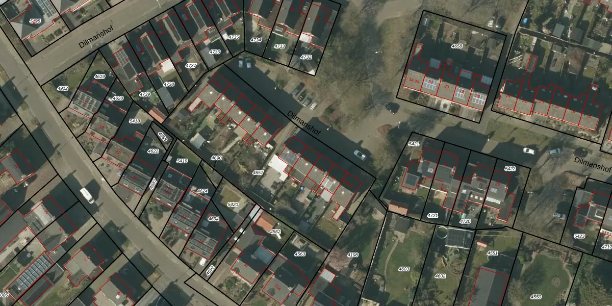 Het perceel waarop Dilmanshof 47 staat heeft een oppervlakte van 1910 m². Dit is een zeer groot perceel. De perceeloppervlakte wordt geregistreerd door het Kadaster. Gedetailleerde informatie over de maten van dit perceel kunt u vinden in het rapport Kadastrale kaart met maatvoering van Dilmanshof 47.