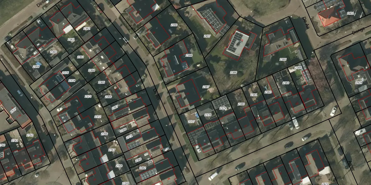 Het perceel waarop Dintel 19 staat heeft een oppervlakte van 449 m². Dit is een groot perceel. De perceeloppervlakte wordt geregistreerd door het Kadaster. Gedetailleerde informatie over de maten van dit perceel kunt u vinden in het rapport Kadastrale kaart met maatvoering van Dintel 19.