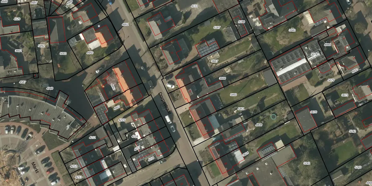 Het perceel waarop Dorpsstraat 15 staat heeft een oppervlakte van 530 m². Dit is een groot perceel. De perceeloppervlakte wordt geregistreerd door het Kadaster. Gedetailleerde informatie over de maten van dit perceel kunt u vinden in het rapport Kadastrale kaart met maatvoering van Dorpsstraat 15.