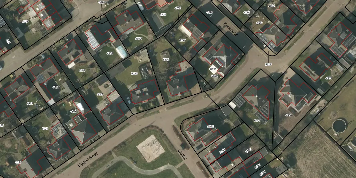 Eggendreef 1 is gelegen op kadastraal perceel SMR02G5100. Deze kadastrale aanduiding is uniek en wordt gebruikt door het Kadaster om eigendomsrechten en andere zakelijke rechten vast te leggen. Het perceel maakt onderdeel uit van de kadastrale gemeente Someren.