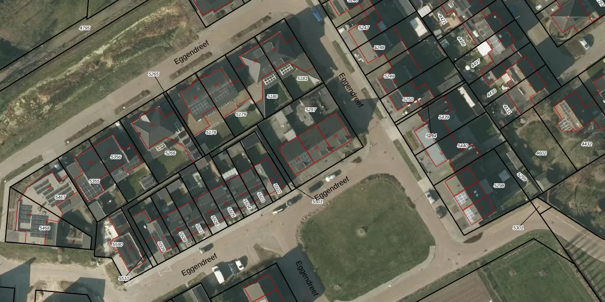 Eggendreef 16 is gelegen op kadastraal perceel SMR02G5297. Deze kadastrale aanduiding is uniek en wordt gebruikt door het Kadaster om eigendomsrechten en andere zakelijke rechten vast te leggen. Het perceel maakt onderdeel uit van de kadastrale gemeente Someren.