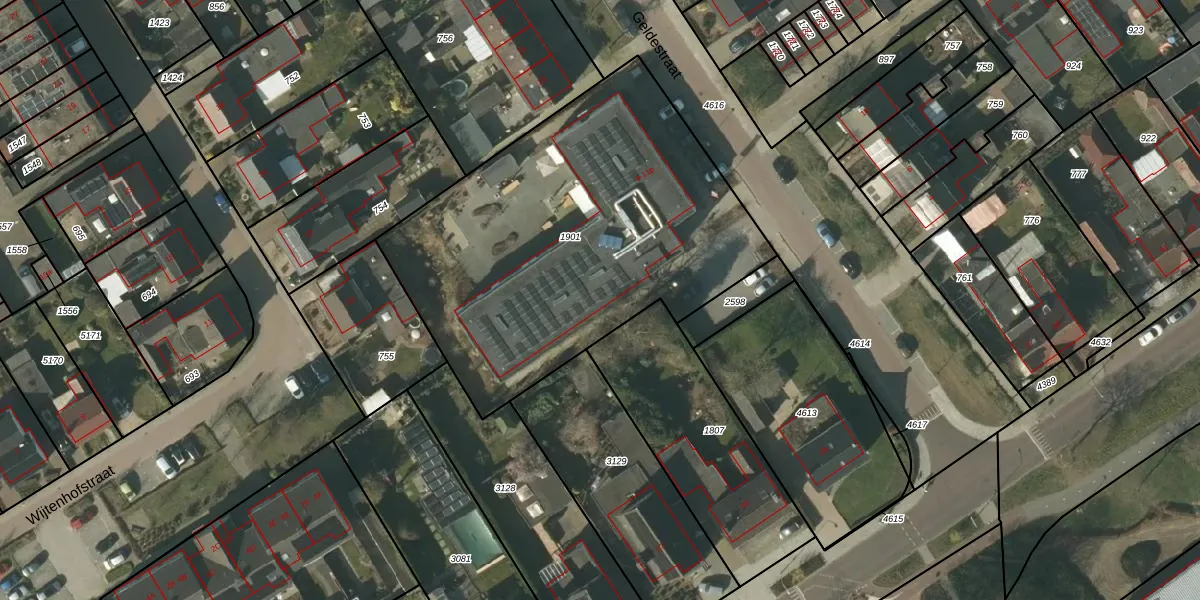 Het perceel waarop Geldestraat 9-b staat heeft een oppervlakte van 2030 m². Dit is een zeer groot perceel. De perceeloppervlakte wordt geregistreerd door het Kadaster. Gedetailleerde informatie over de maten van dit perceel kunt u vinden in het rapport Kadastrale kaart met maatvoering van Geldestraat 9-b.