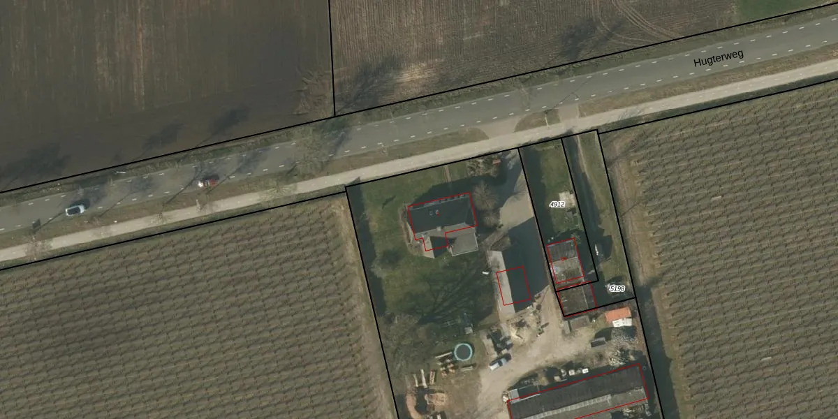 Het perceel waarop Hugterweg 1 staat heeft een oppervlakte van 6275 m². Dit is een zeer groot perceel. De perceeloppervlakte wordt geregistreerd door het Kadaster. Gedetailleerde informatie over de maten van dit perceel kunt u vinden in het rapport Kadastrale kaart met maatvoering van Hugterweg 1.