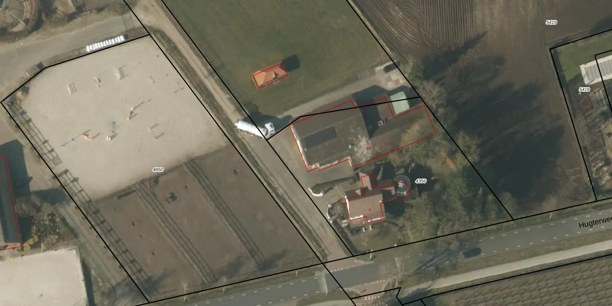 Het perceel waarop Hugterweg 4-a staat heeft een oppervlakte van 2535 m². Dit is een zeer groot perceel. De perceeloppervlakte wordt geregistreerd door het Kadaster. Gedetailleerde informatie over de maten van dit perceel kunt u vinden in het rapport Kadastrale kaart met maatvoering van Hugterweg 4-a.