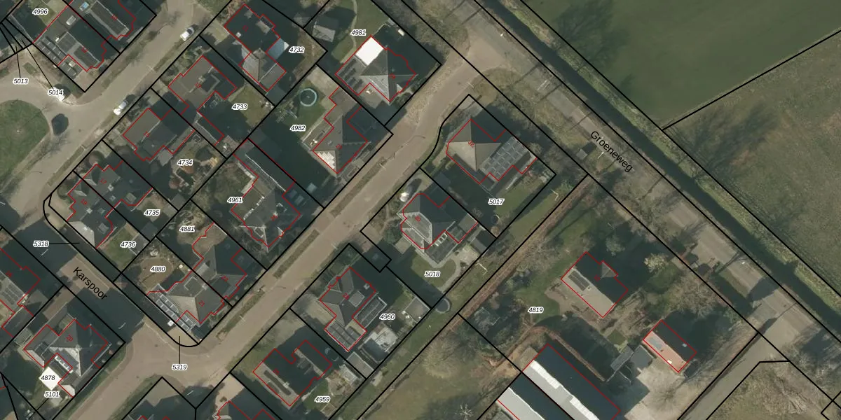 Het perceel waarop Karspoor 30 staat heeft een oppervlakte van 547 m². Dit is een groot perceel. De perceeloppervlakte wordt geregistreerd door het Kadaster. Gedetailleerde informatie over de maten van dit perceel kunt u vinden in het rapport Kadastrale kaart met maatvoering van Karspoor 30.