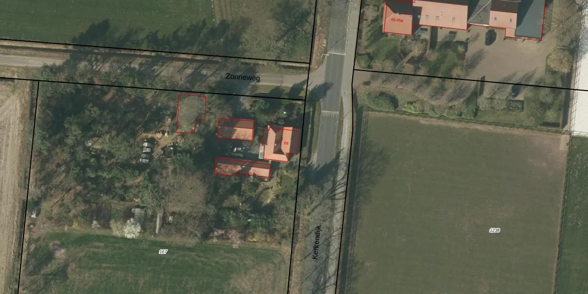 Het perceel waarop Kerkendijk 68 staat heeft een oppervlakte van 1,2 ha. Dit is een zeer groot perceel. De perceeloppervlakte wordt geregistreerd door het Kadaster. Gedetailleerde informatie over de maten van dit perceel kunt u vinden in het rapport Kadastrale kaart met maatvoering van Kerkendijk 68.