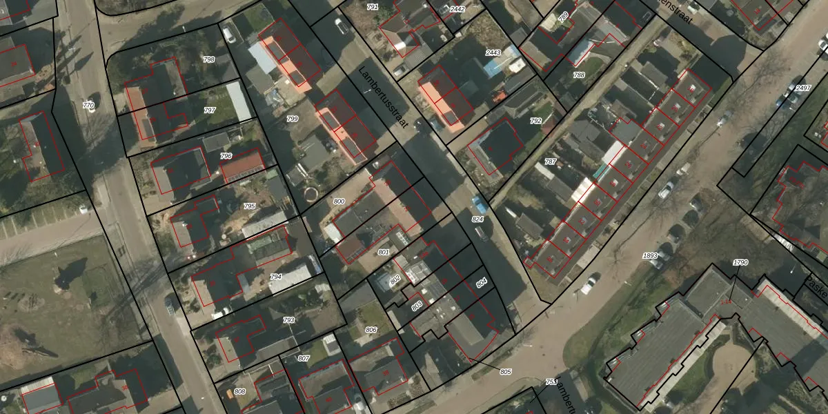 Het perceel waarop Lambertusstraat 21 staat heeft een oppervlakte van 363 m². Dit is een groot perceel. De perceeloppervlakte wordt geregistreerd door het Kadaster. Gedetailleerde informatie over de maten van dit perceel kunt u vinden in het rapport Kadastrale kaart met maatvoering van Lambertusstraat 21.