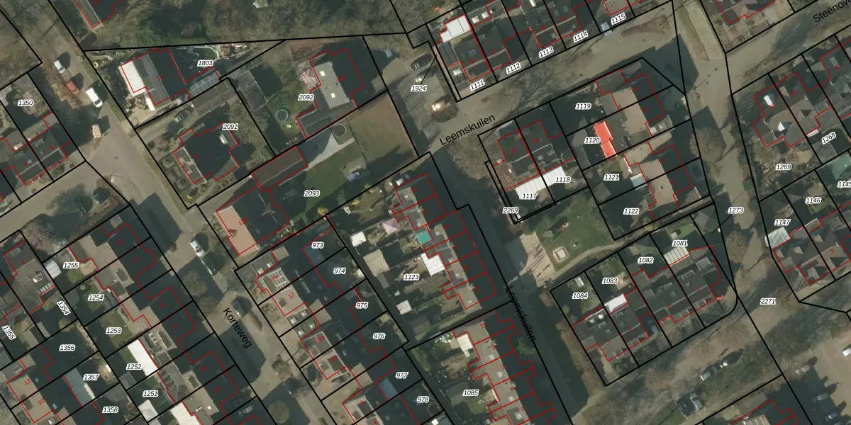Het perceel waarop Leemskuilen 21 staat heeft een oppervlakte van 1077 m². Dit is een zeer groot perceel. De perceeloppervlakte wordt geregistreerd door het Kadaster. Gedetailleerde informatie over de maten van dit perceel kunt u vinden in het rapport Kadastrale kaart met maatvoering van Leemskuilen 21.