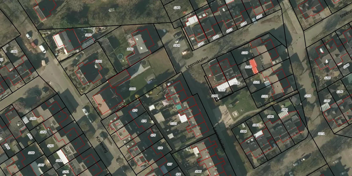 Het perceel waarop Leemskuilen 23 staat heeft een oppervlakte van 1077 m². Dit is een zeer groot perceel. De perceeloppervlakte wordt geregistreerd door het Kadaster. Gedetailleerde informatie over de maten van dit perceel kunt u vinden in het rapport Kadastrale kaart met maatvoering van Leemskuilen 23.